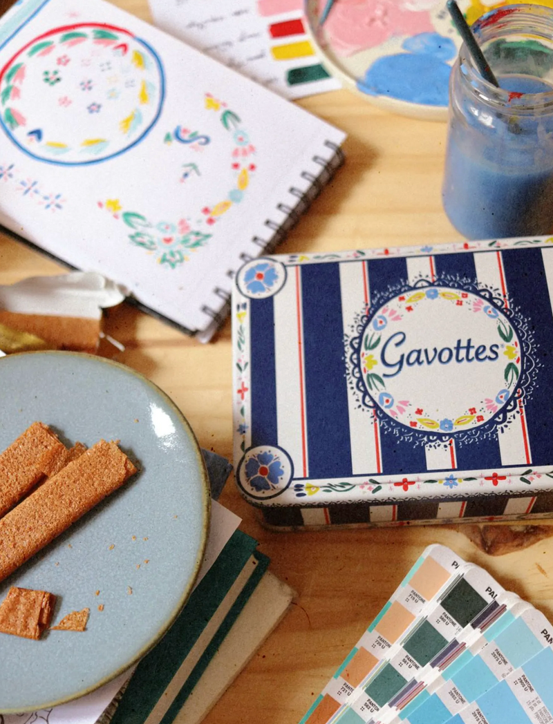 Quand Gavottes décide d’ouvrir ses coffrets et ses accessoires à l’univers graphique de Amour Breton, ce n’est pas seulement un « packaging » qui change : c’est tout un imaginaire qui se dessine ! Avec le studio on à plongé dans l’héritage des souvenir de vacances bretonnes, motifs marinières, faïences, dentelles,… pour habiller une gamme en édition limitée de Gavottes : coffrets métal, tote-bags, cartes postales, sacs de plage… L’enjeu : rendre visible l’attachement à la Bretagne ! « Une collaboration qui sonne comme une évidence » autant pour Gavottes que pour nous. Ce type de partenariat va au-delà du produit : il colle à votre univers de designer et directrice artistique. Il prouve que les marques gourmandes peuvent chanter la culture, que l’art visuel peut adoucir le biscuit, qu’une identité forte (Amour Breton) peut rencontrer un patrimoine populaire (Gavottes) pour créer quelque chose de nouveau. En résumé : la collaboration Gavottes × Amour Breton est un bel exemple d’alliage tradition bretonne + créativité contemporaine. Elle fait passer la crêpe dentelle du rayon épicerie fine à l’étagère de design, et, pour Amour Breton, on a adoré affirmer le pouvoir du motif et de la narration visuelle appliqués à des objets du quotidien.