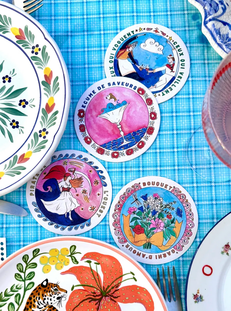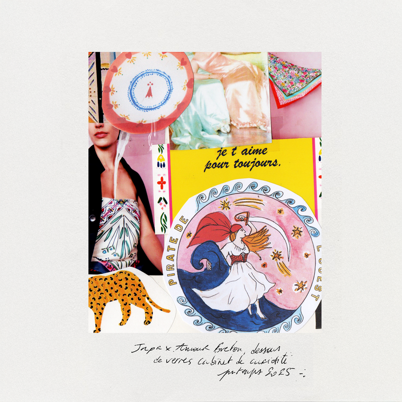 Quand l’équipe JNPR nous à contactée pour imaginer une collaboration entre nos deux marque, nous avons de suite trouvé le pont entre nos deux univers : l’aventure, le partage, les histoires qu’on se raconte autour d’un verre. Au studio on a eu envie de vous embarquer dans un cabinet de curiosités, un espace visuel inspiré de nos deux mondes, riche, joyeux, un brin mystérieux. Pour commencer, on voulait une figure forte, ancrée dans la mer et la conquête : Jeanne de Belleville, célèbre pirate bretonne surnommée “la Tigresse bretonne” (perso, on veut bien le même blase svp). On a adoré plonger dans son histoire, explorer son iconographie, et vous proposer une version Amour Breton de cette héroïne flamboyante de la piraterie. On y retrouve aussi un poisson irréel qui saute dans un verre, souvenir entre rêve et réalité d’un voyage imaginaire, un bouquet d’épices de spiritueux mélanger joyeusement avec des fleurs bretonnes typique comme le camélia ou encore un hommage à celles et ceux qui célèbre le retour de l’amour.