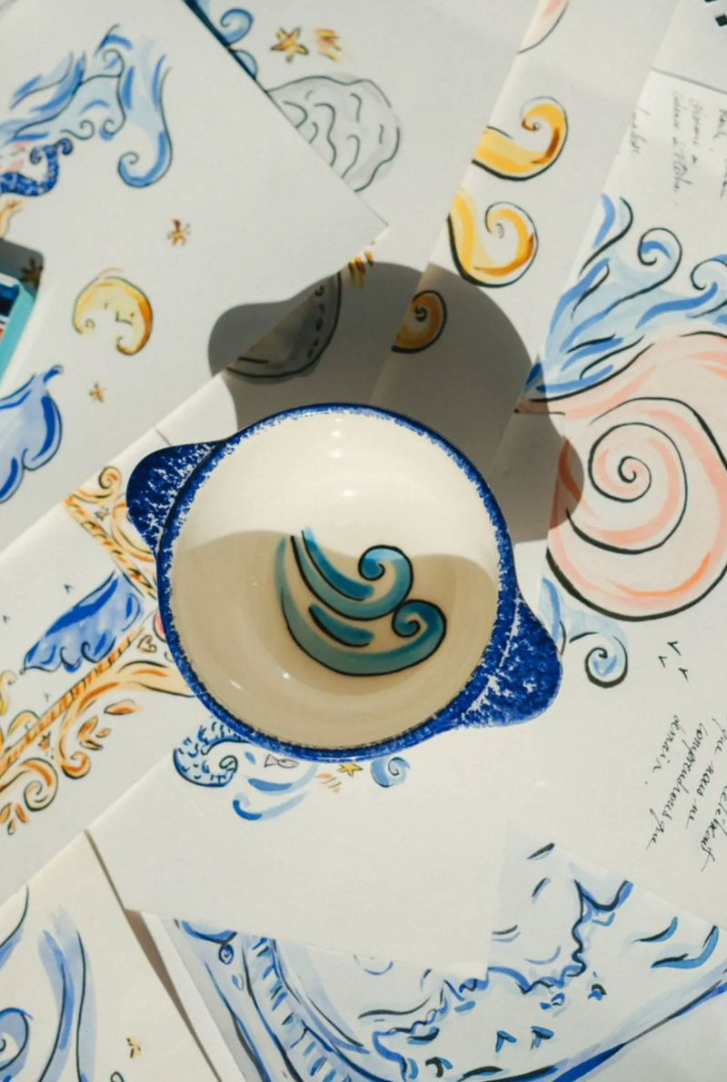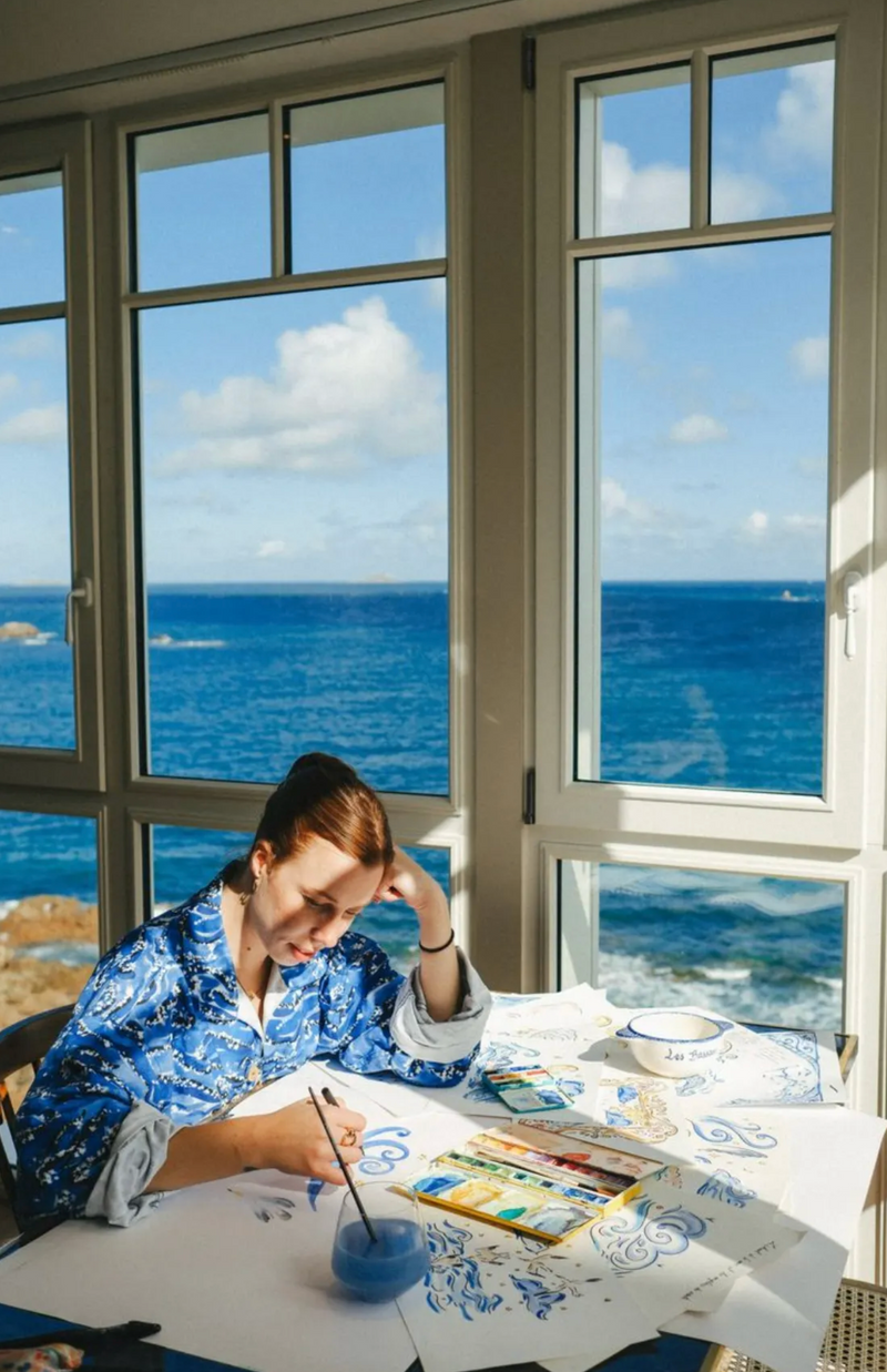 Accompagner dès le réveil les voyageurs des Domaines de Fontenilles pour l’hôtel Les Bassans à Perros Guirec c’est comme prolonger un rêve. Au studio on a imaginé un geste inspiré entre la vague et le vent, un mouvement hyper souple qui réside dans le lâché prise. C'est aussi ce qu'on ressent chez Les Bassans suspendu au-dessus de l'eau, comme une tour d’observation poétique, tournée vers l’horizon. On se sent comme un oiseau qui plane au-dessus de la mer, connecté aux vents de la Manche. Une respiration libre, en équilibre.